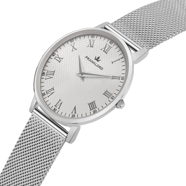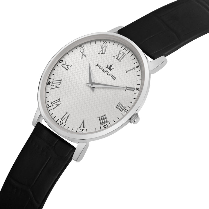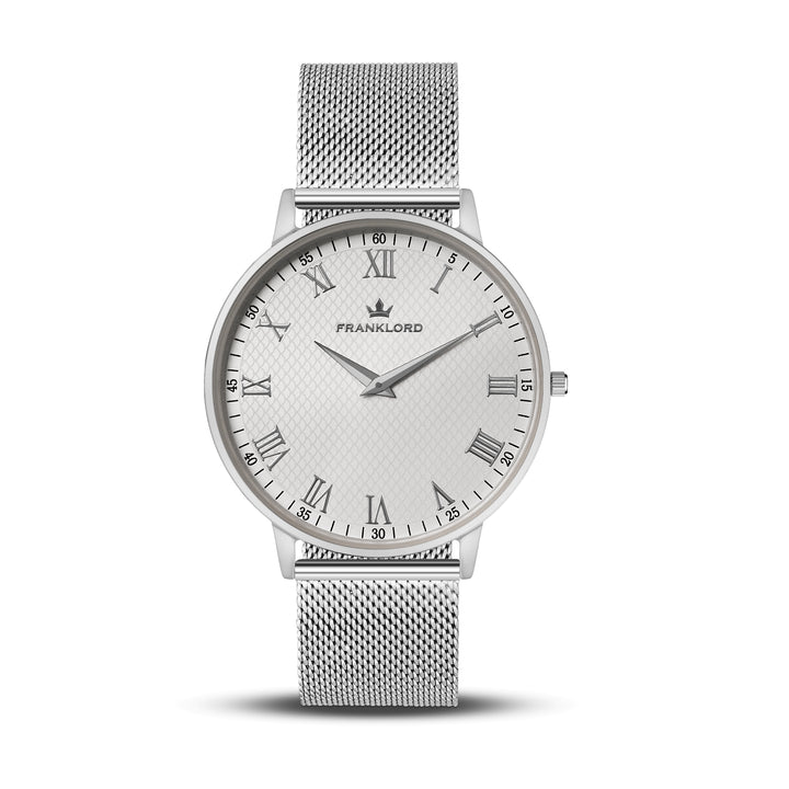 The Classique Sterling is the epitome of our dedication to timeless design. This exquisite silver watch for men is crafted for those who appreciate understated elegance and flawless craftsmanship. The brilliant stainless steel case houses a captivating white dial with a textured guilloché pattern, creating a subtle play of light that draws the eye. Classic Roman numerals and sharp hands provide a clear, legible, and heritage-inspired display.