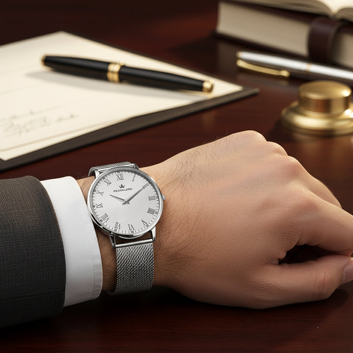 Perfectly suited as a formal watch for milestone events or a sophisticated everyday watch for the office, its versatility is unmatched. The ultra-slim 6mm profile ensures a comfortable and refined fit, while the fluid silver Milanese strap adds a touch of modern texture. Inside, a precise Japanese movement provides the reliability and accuracy that defines a truly great timepiece.