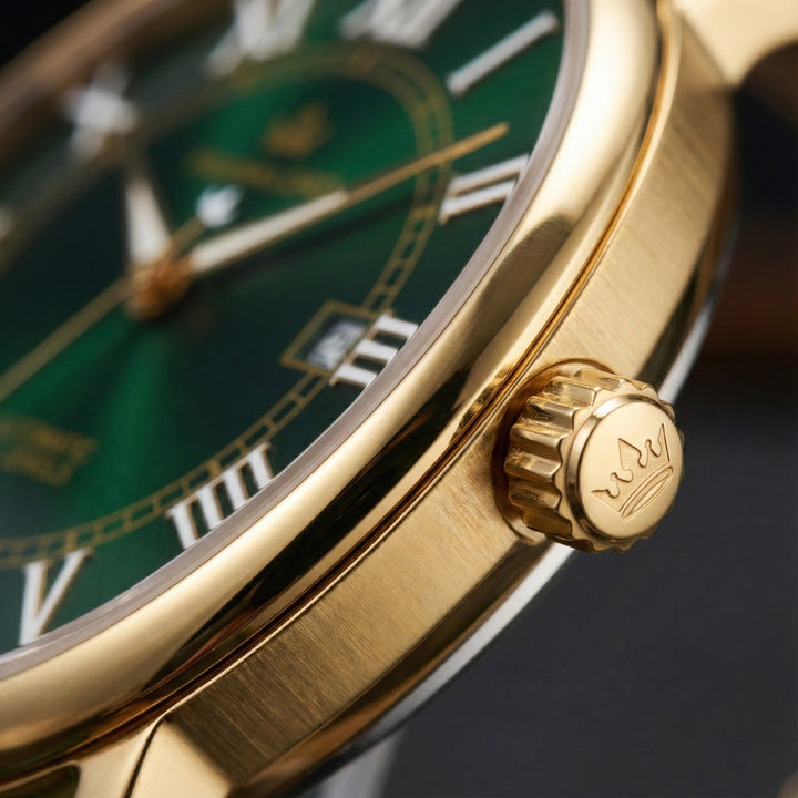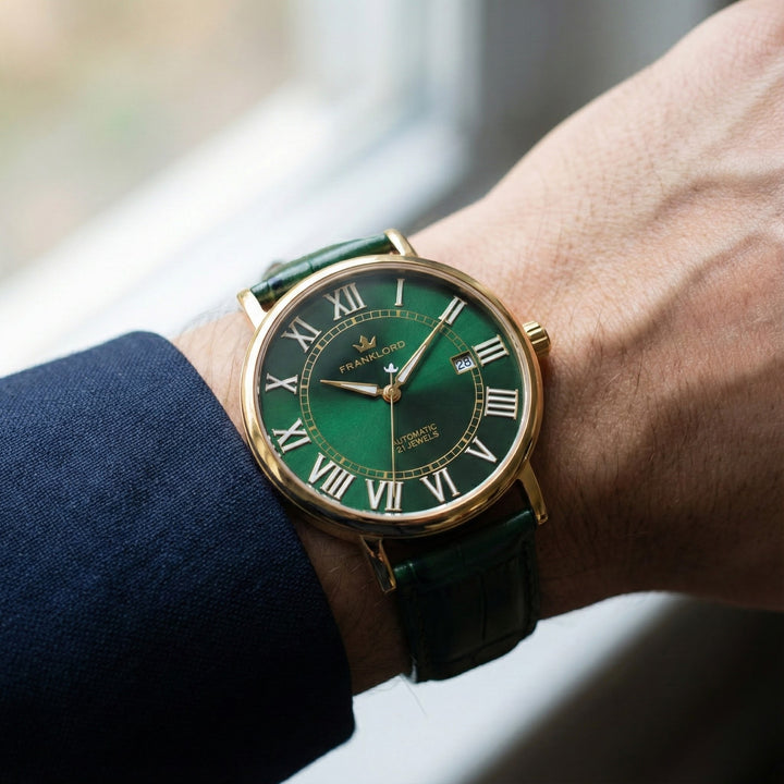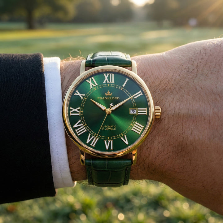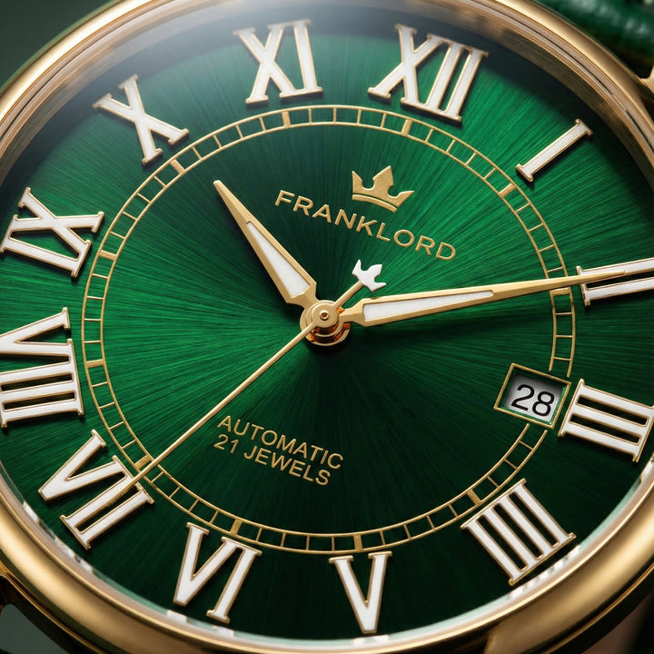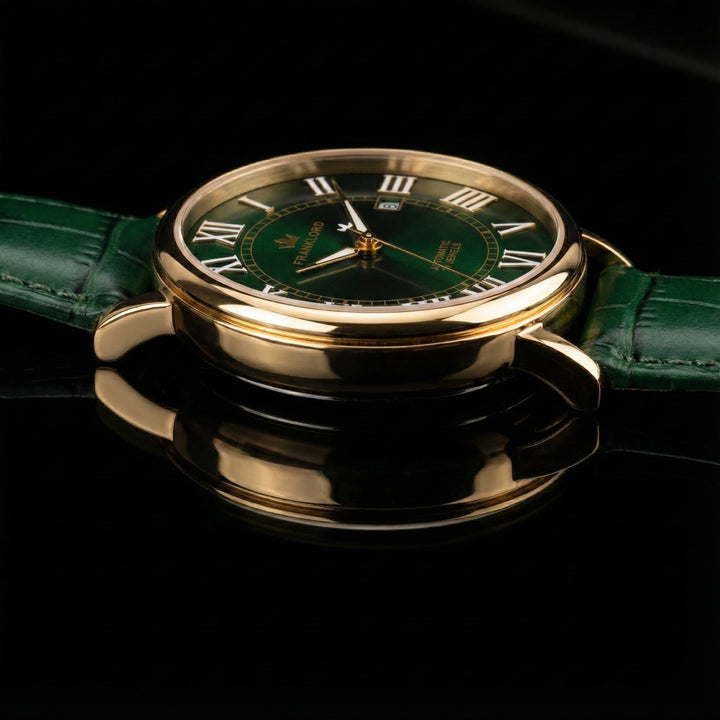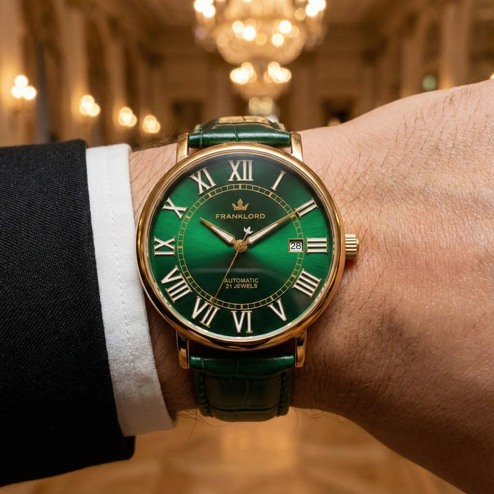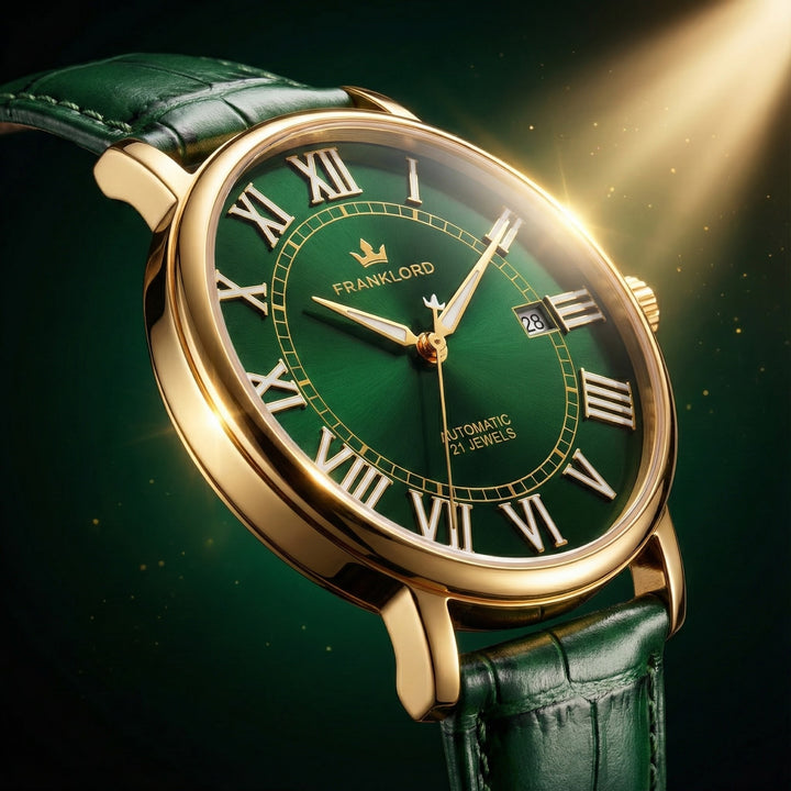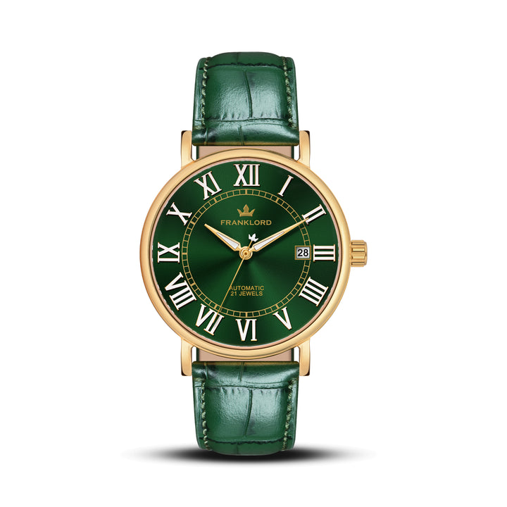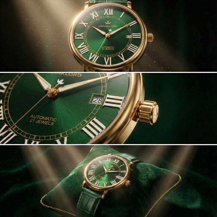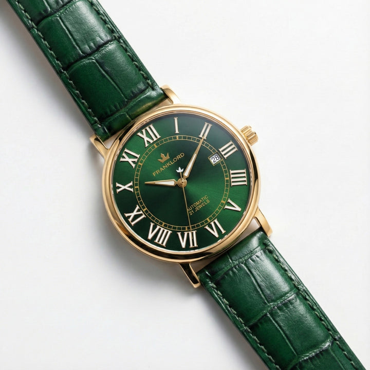 Step into a world of royal elegance with the Franklord Eternal Roman Automatic – Emerald Gold Edition, crafted for those who appreciate timeless sophistication and dependable engineering.
