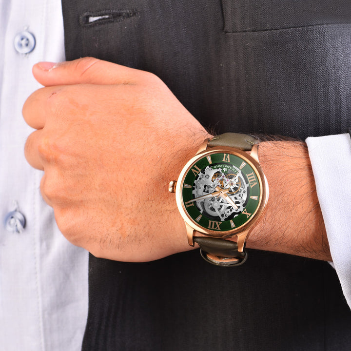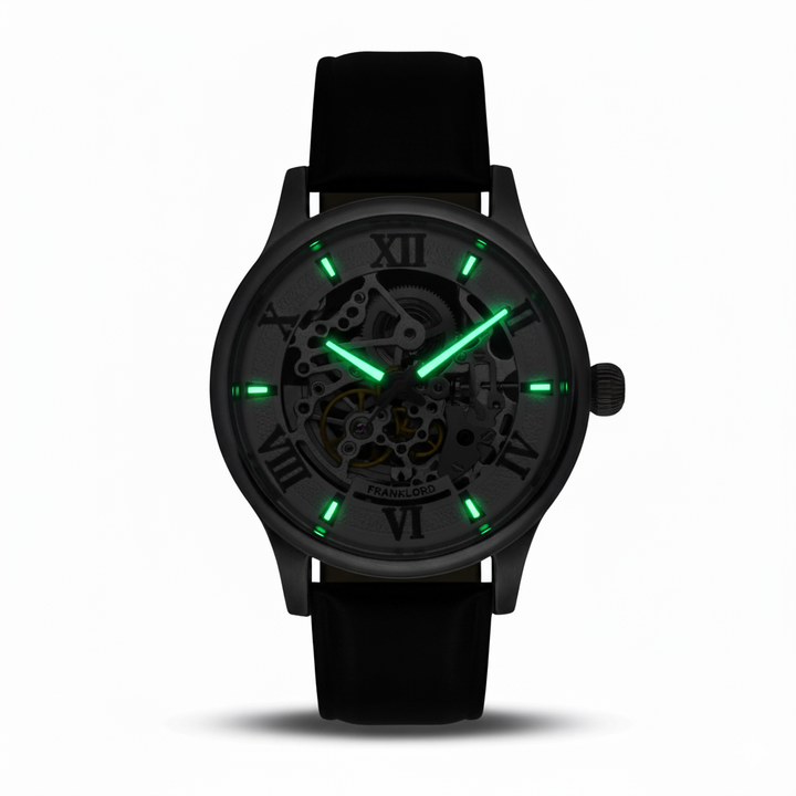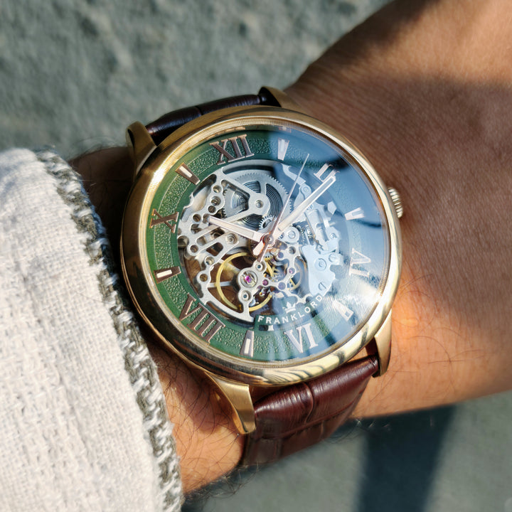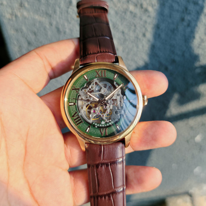 Introducing the Franklord Infinity Gear - Emerald Fusion, where timeless design fuses with the raw beauty of mechanical precision. This isn't just a timepiece; it's a statement. With its mesmerizing see-through skeleton dial, the Emerald Fusion invites you to witness the very heartbeat of time—a constant, rhythmic dance of gears and springs.